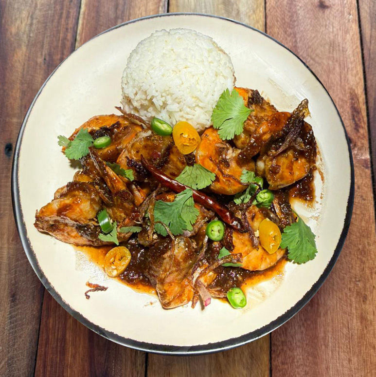 Goong Pad Makam – shrimp in a sweet, savory, and slightly spicy tamarind sauce