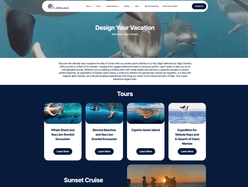 The Baja Charters home page welcomes you with a clean, inviting layout that highlights all the key parts of the site right away. From here, you can jump straight into browsing tours, private charters, or specific experiences like snorkeling with whale sharks and sea lions, exploring remote beaches, searching for mobula rays, or taking serene sunset cruises.