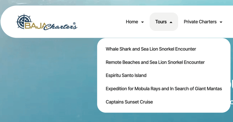 At the top of the site, the menu gives you quick access to every major section — including Tours, Private Charters, Fishing, the Baja Charters Blog, and the Sea of Cortez Guide. Whether you’re ready to book now or simply researching what to do first, every part of the site is just a click away.