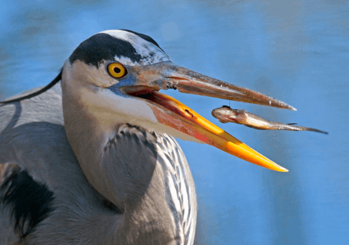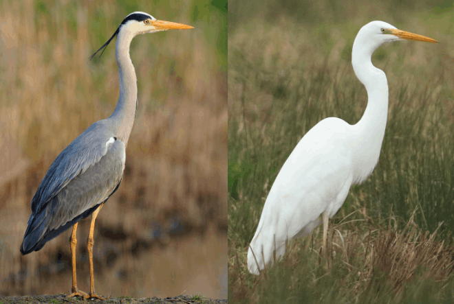 Herons and egrets hunt by standing perfectly still or slowly stalking their prey before striking with lightning-fast precision—often catching their meal in a single jab.