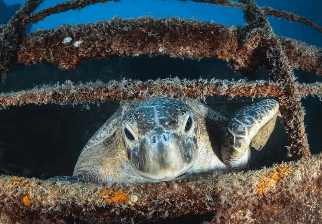 Green sea turtles resting inside the ship