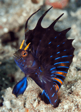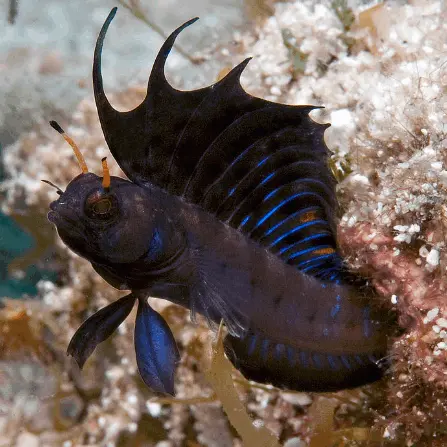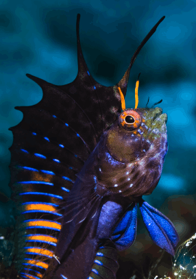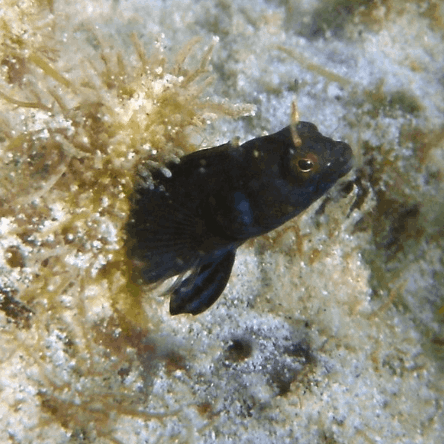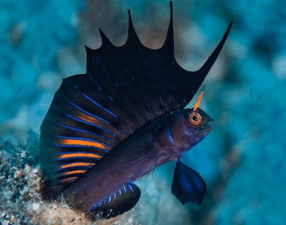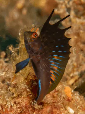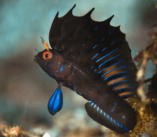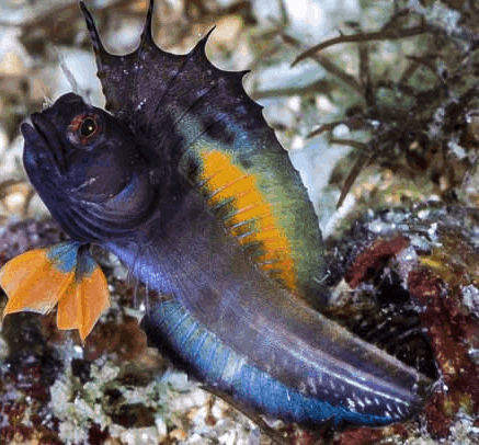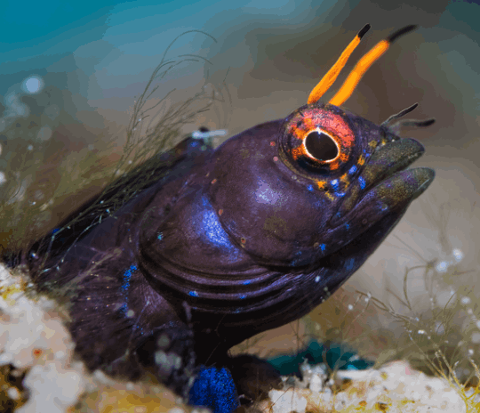 The Gulf Signal Blenny grows to only about 4–6 cm. Males show off flashes of neon blue, yellow, and black when trying to impress females or ward off rivals.