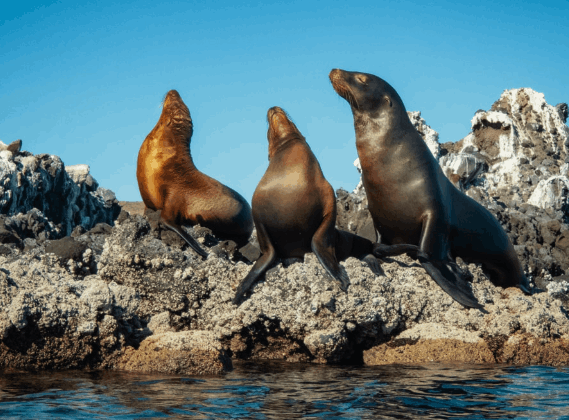 Sea lion colonies often nap on rocky outcrops, and some pups are known to swim by to check you out. They’re basically the golden retrievers of the sea.