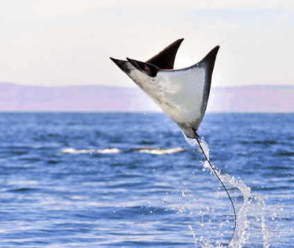 On warm days, golden cownose rays sometimes glide in formation beneath the surface. And if you’re lucky — you’ll see flying mobula rays launching out of the ocean like acrobats.