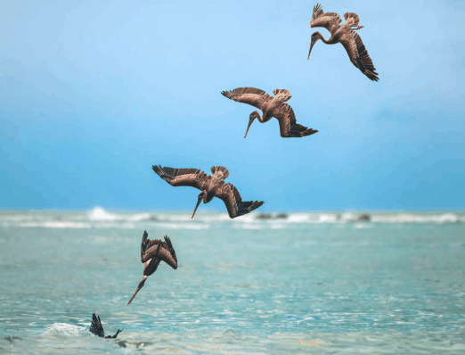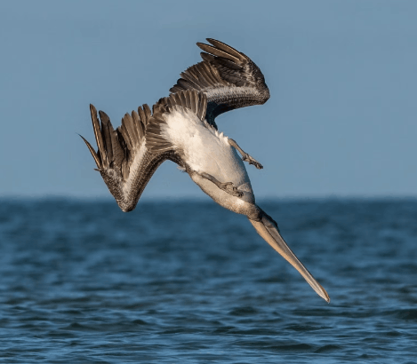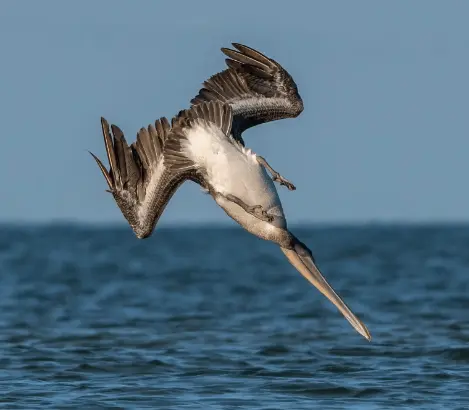 When they spot fish, pelicans fold their wings and plunge headfirst from heights of up to 60 feet. The splash is impressive, but even more impressive is the accuracy. They rarely miss.