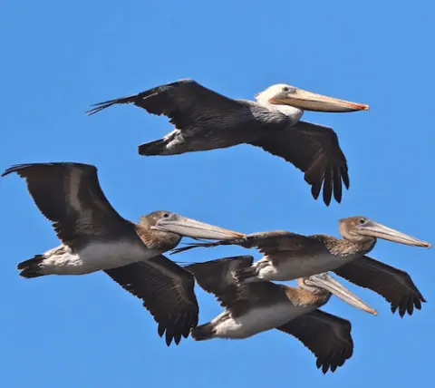 Brown Pelicans ride coastal wind currents like surfers ride waves. They glide inches above the water’s surface using a technique called ground effect, reducing drag and making flight look like a calm ocean ballet.
