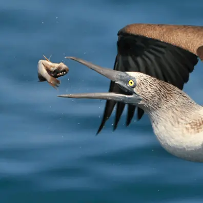 Blue-footed boobies feed mainly on sardines, anchovies, and mackerel. Their streamlined bodies and sharp beaks help them catch slippery prey with precision.
