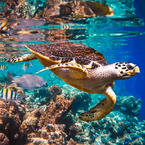 The Hawksbill turtle is known for its stunning, patterned shell made of overlapping scales—once tragically prized for jewelry and decoration. Thankfully, strong conservation laws now protect these critically endangered beauties.