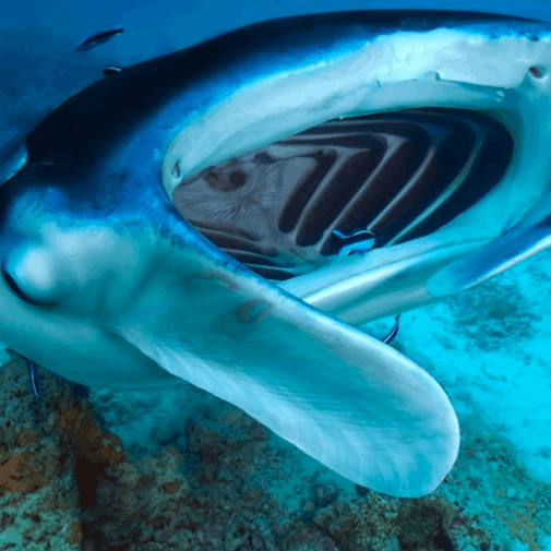 Unlike most rays that feed on bottom-dwelling organisms, giant mantas are filter feeders. They use their cephalic fins—those horn-like appendages on their heads—to funnel plankton and small fish into their wide mouths.