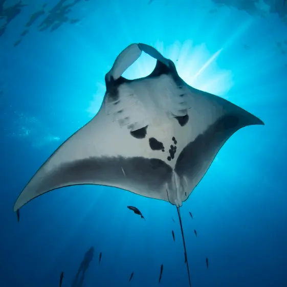 Despite their enormous size, mantas are completely harmless. They don’t have stingers like stingrays and pose no threat to divers.